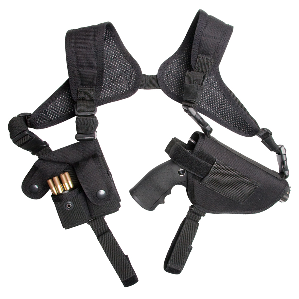 Designed especially for Dan Wesson Revolvers. Shoulder holster for revolvers with 2 speed loader pouches. Size is fully adjustable allowing you to wear the holster concealed or overtly. This holster can quickly be changed for either left or right handed players. Retention strap with push button snaps open for a fast draw. A additional safety strap keeps the gun securely in the holster during the most rigorous activities.