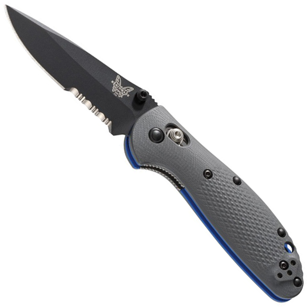 The lightweight Benchmade Mini Griptilian Drop Point Serrated Knife (Black Blade) fits easily in your hand with its sleek G10 built scaled handle. The drop point blade blade is covered in an all black finish over its premium CPM-20CV stainless steel build. Its ambidextrous design has dual thumb studs for easy blade deployment with either your left or right hand.