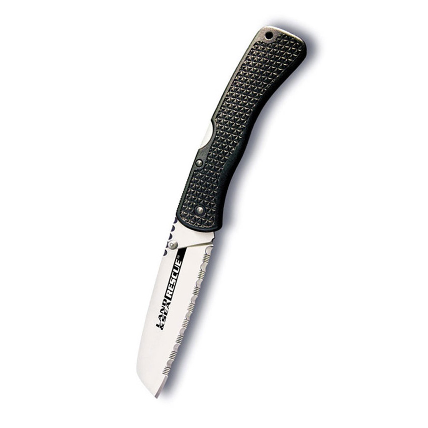 When someone’s life is in danger, there is often not enough time to fumble around trying to open a Swiss Army or “tool” type knife and then saw frantically in a desperate bid to free them. Those knives have blades that are just too short, narrow and dull to immediately sever thick, tough, or fibrous material. When seconds count, the Land & Sea/Rescue Knife is more than equal to the challenge. In an emergency, it can be opened in the blink of an eye, and the innovative rocker lock allows worry-free deployment when a life is on the line. Once locked open, the blade can cut with the fury of a chainsaw with its wide, flat ground surface and serrated edge. The unique “sheep’s foot” style VG-1 Stainless blade is ideal for rescue situations because it is less likely to injure accident victims when cutting away seat belts or clothing. And the tough, Zytel® handle is contoured and deeply checkered for a solid, non-slip grip. The Land & Sea/Rescue™ Knife sports a small, but powerful steel pocket clip, to keep the blade within easy reach at all times.