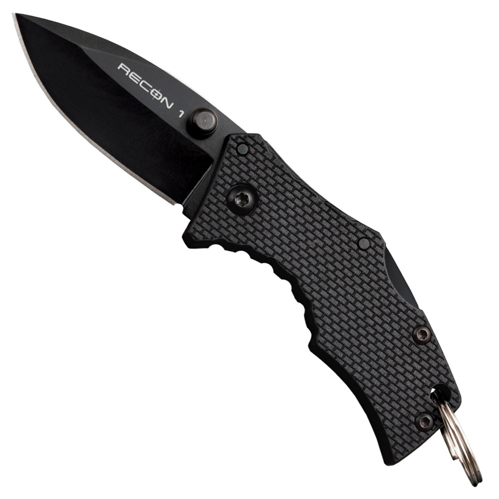 Cold Steel is famous for raising the bar in the knife industry and our Recon 1® tactical folders are setting a standard that's hard to beat. Why? Because they are as tough as nails and will cut like a chain saw! Available with 3 and 4 in blades, every facet of their construction has been over engineered to make them as strong, durable and effective as humanly possible. The blades are made out of imported Japanese AUS 8A stainless steel that's been vacuum heat treated and sub-zero quenched and the handles feature G-10 laminate scales artfully contoured and scalloped for a terrific non slip grip. Plus, they are held together by the latest in high strength mechanical fasteners and further anchored by a 6061 heat-treated spacer. To complement their super tough blades and handles they're equipped with our revolutionary Tri-Ad lock™ , which practically precludes lock failure. To complement their tactical mission we have given each blade a tough, black, Tuff-Ex™ finish. Our testing has shown this coating offers three major advantages for tactical blades. First, it helps the blade to resist rust. Second, it eliminates glare and light reflections, which may give its user away. And third, it's a superior lubricant, which causes the blade to slip through even tough material with markedly less friction. This means you can cut deeper and far longer than with a non-Tuff-Ex™ coated blade. To make the Recon 1® as easy to open and carry as possible we have equipped each knife with a thumb stud and a small, extra strong pocket clip. This clip is completely ambidextrous so lefties please take note. What's more its small size doesn't abrade or irritate the palm under protracted use.