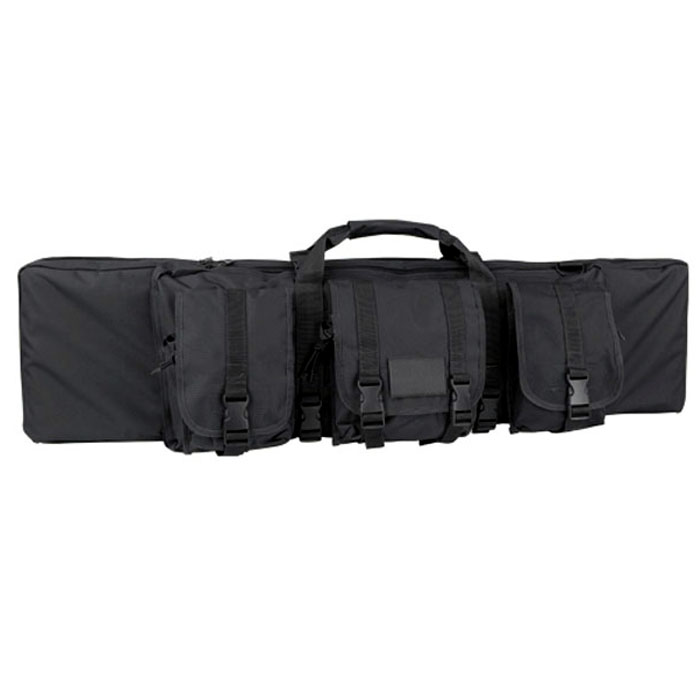 Take your gun on the go with the Condor Tactical 42 Inch Single Rifle Case. This sleek and stylish gun bag is fully padded, with hook and lock straps and a bungee retaining system to hold any rifle firmly and securely. The secondary compartment has 2 pockets for pistol or SMG side arms. Removable MOLLE pouches are included to store magazines, shells, ammo boxes or tools. Black colour is non-reflective and low-profile.
