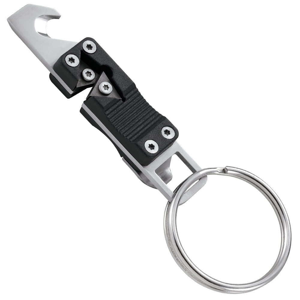 Anyone who uses a knife regularly knows that having a sharp blade edge is much safer than trying to make a dull blade do the job. Designer Tom Stokes created this compact sharpener so it would be easy to have along, and keep you sharp. You simply hold it firmly on a hard surface, place the rear of the blade edge into the "V" of the carbide sharpener blades and draw the knife through, pulling towards you. This handy tool also features a flathead screwdriver, small channel blade/cutter, and bottle opener. The Stokes Keychain Sharpener also comes with a split-ring for easy carry attachment.