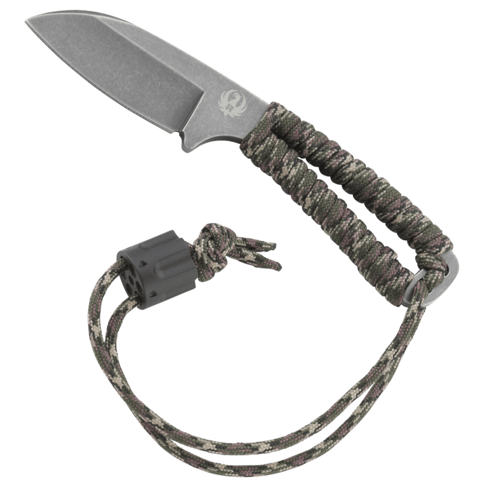 The pint-sized CRKT Ruger Cordite Fixed Blade Knife packs a ton of cutting power into its small frame. Equally suitable for everyday carry and outdoor work, the 2.5 inch blade is designed to tackle a wide range of camping and hiking tasks. A tribute to the rugged Ruger style, the knife features a paracord wrapped handle and an adjustable lanyard with a "revolver-style" bead cylinder. A glass reinforced nylon sheath is included with the neck knife.