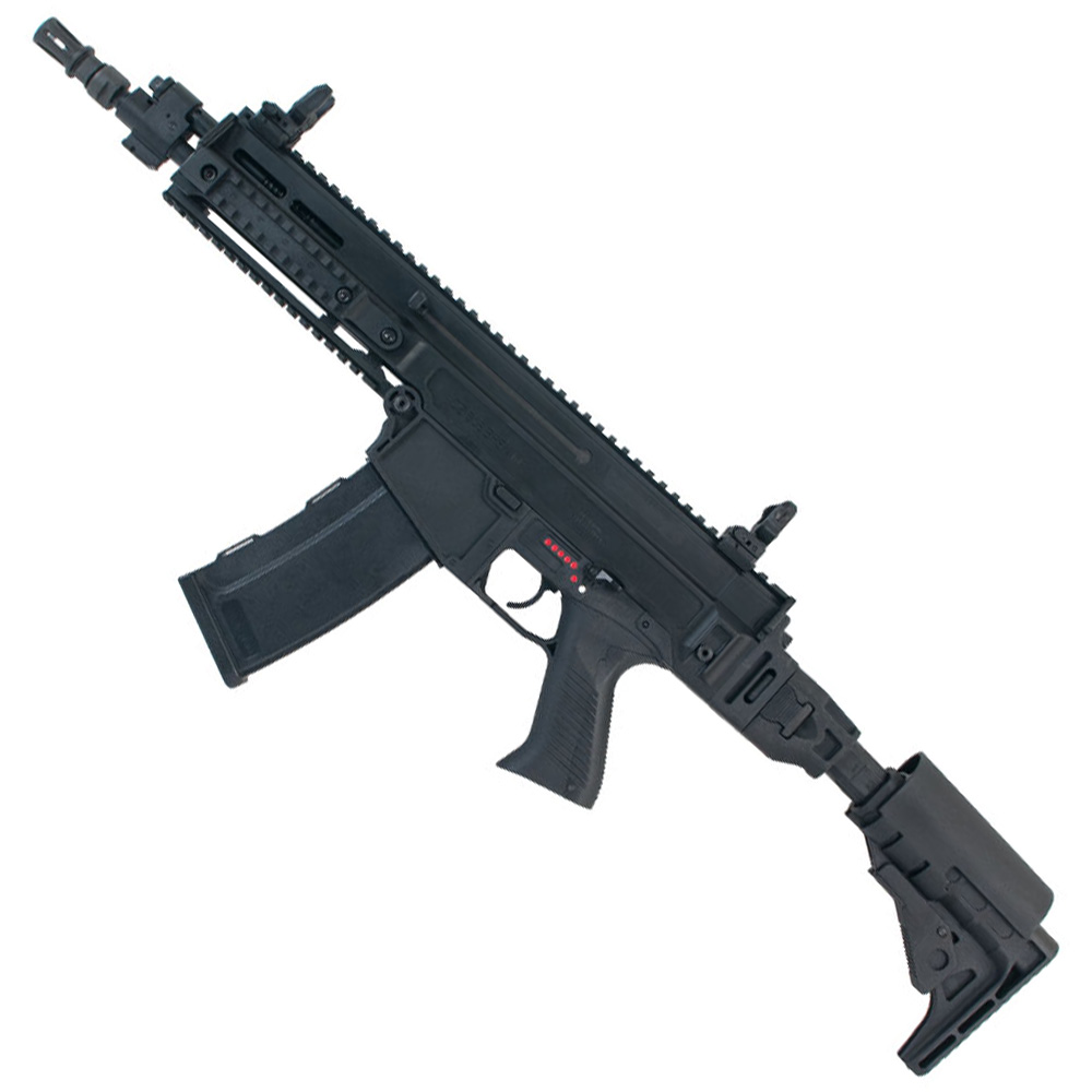The CZ 805 BREN A2 AEG Assault Rifle is ready for battle. This compact and maneuverable AEG comes equipped with a foldable stock, which be adjusted for length or removed completely when maximum compactness is required for CQB. Picatinny rails run along the top, bottom, and sides, making it easy to attach accessories. Includes front and rear removable folding sights.