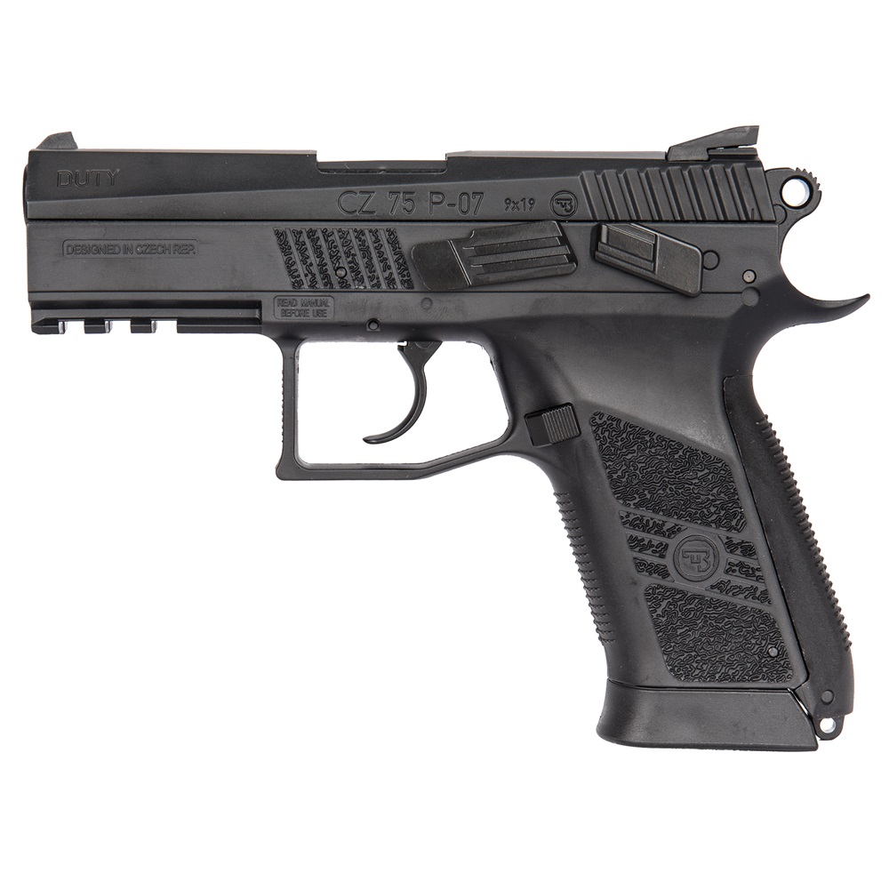 The CZ75 P-07 is a semi-auto .177/4.5mm steel or copper bb pistol which uses a 12g CO2 cylinder. The pistol comes with a 26 shot magazine and should get 50-60 shots out of a single CO2 canister.