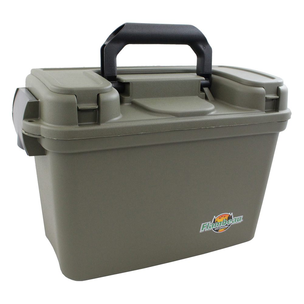 The Flambeau Sportsman's Dry Box provides waterproof storage for fishing tackle, tools, shooting equipment, and other tactical gear. It has a durable polymer construction with 360-degree rubber water-resistant gasket. This 14" model has a mid-size inner compartment for smaller tools, as well as a removable tray, and a flip-top lid chamber. It has an easy-access OTC latch and is padlock compatible.