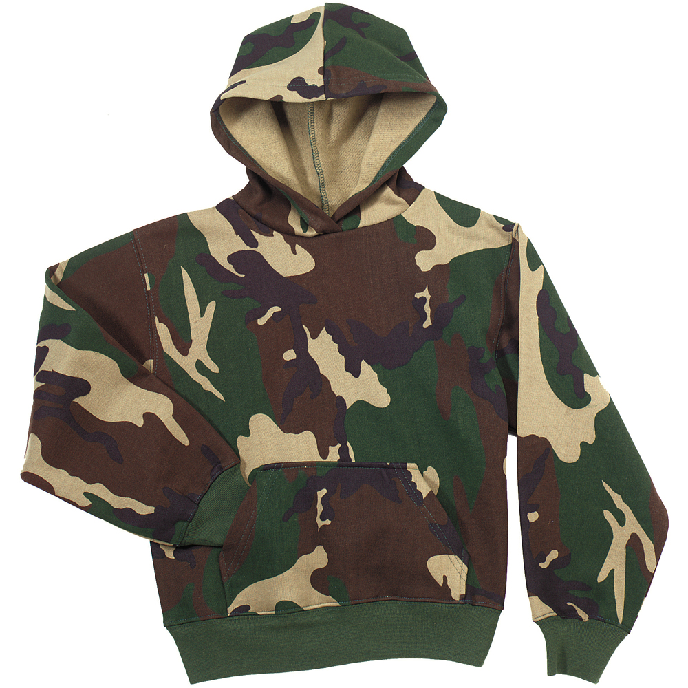 Kids Camo Pullover Hooded Sweatshirt is fleeced lined with a poly cotton camo outer-shell.