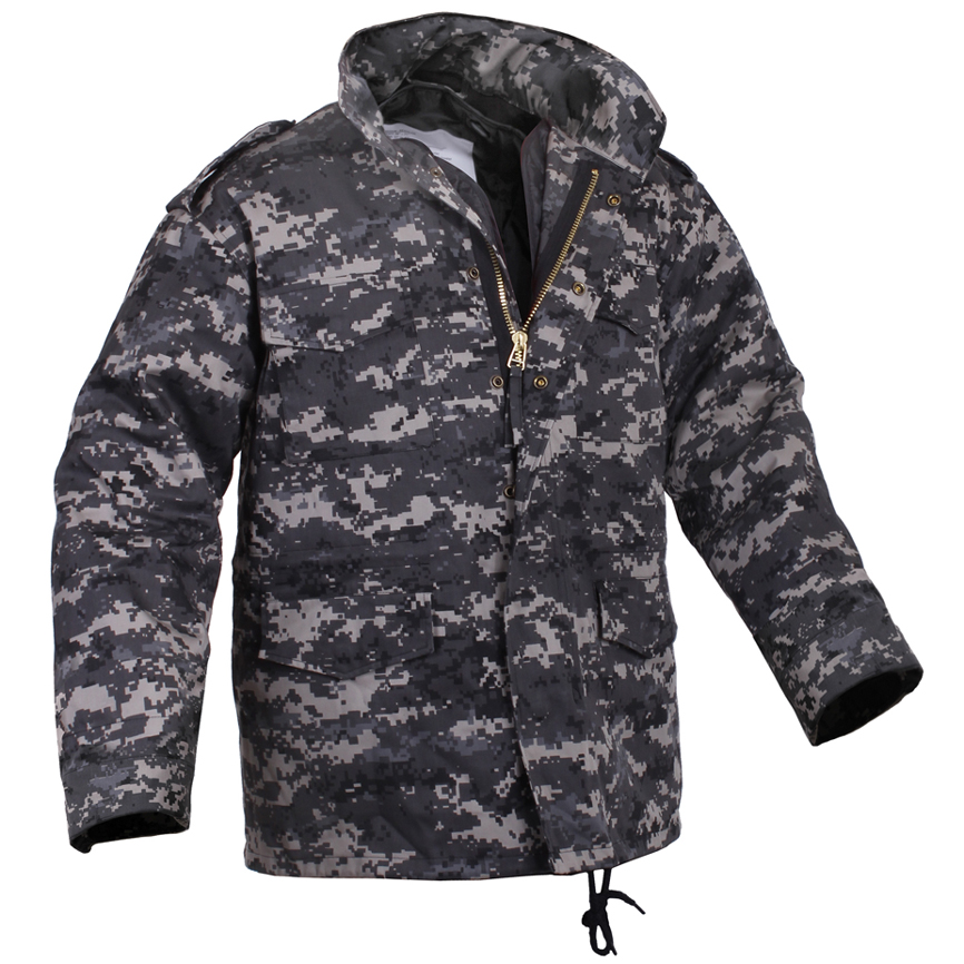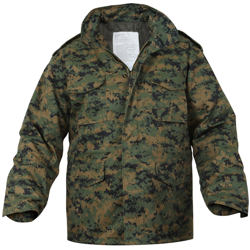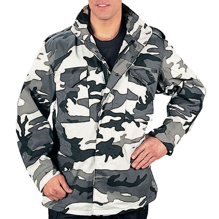 This jacket has a camouflage look, which makes it ideal for outdoor, especially when you want to be adventurous. It is available in a number of sizes. Since it is made of tough material (either polyester or cotton twill), it is extremely durable. A strong brass zipper provides for easy handling. Besides, the jacket is water repellent; thus you can safely wear it in a rough weather. It has a concealed hood for added protection, which can be folded neatly when you do not want to use it. The four snap-up pockets let you carry utility items with ease.