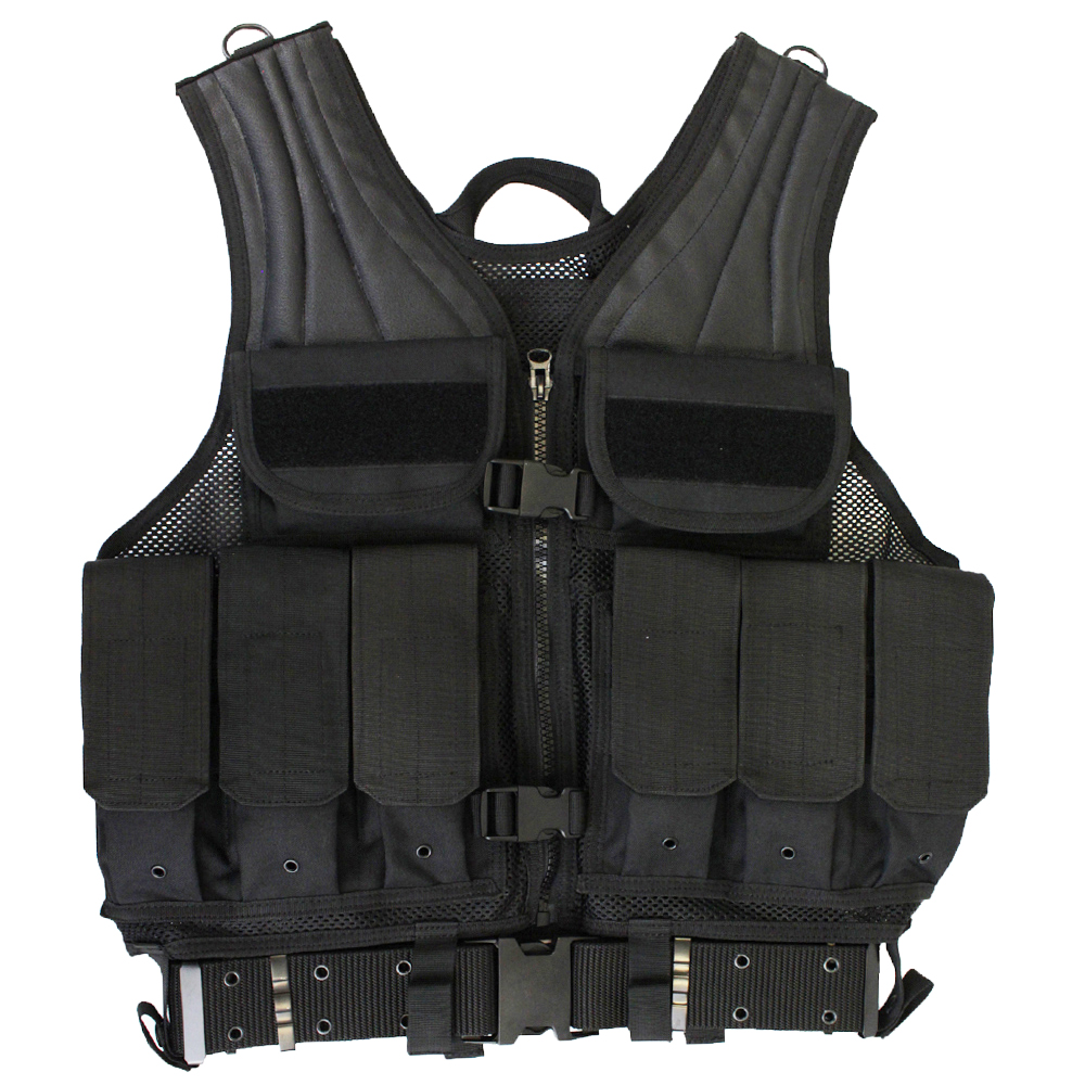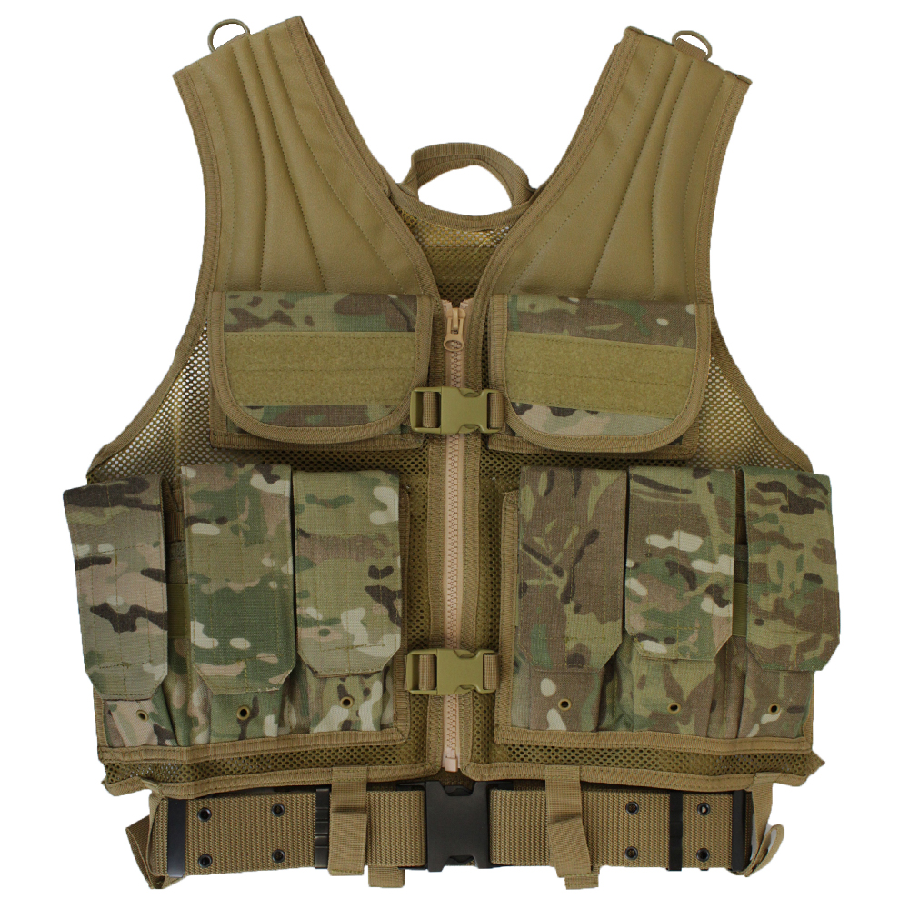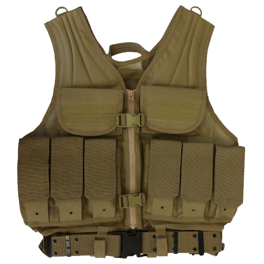 Keep your gear close to your chest with this Raven X MOLLE Tactical Vest. It's equipped with 10 utility pouches for magazines and other equipment, as well as a large hydration bladder compartment. Modular webbing along the back allows for accessory customization. A modular web belt is included and looped through built-in snap-fastener belt straps. Tan colour is optimized for desert camouflage.