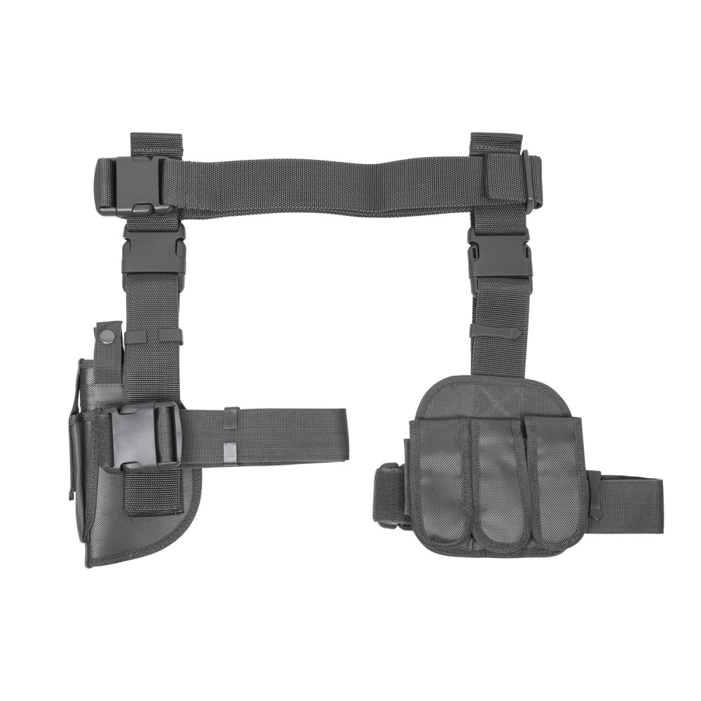 Give your pistol some support with the Ncstar Tactical Mag Holder/Gun Leg Holster. Both pieces have four magazine pouches in total to keep you stocked up on ammo. The holster and pouch can be adjusted up and down your leg with the adjustable straps and buckles.