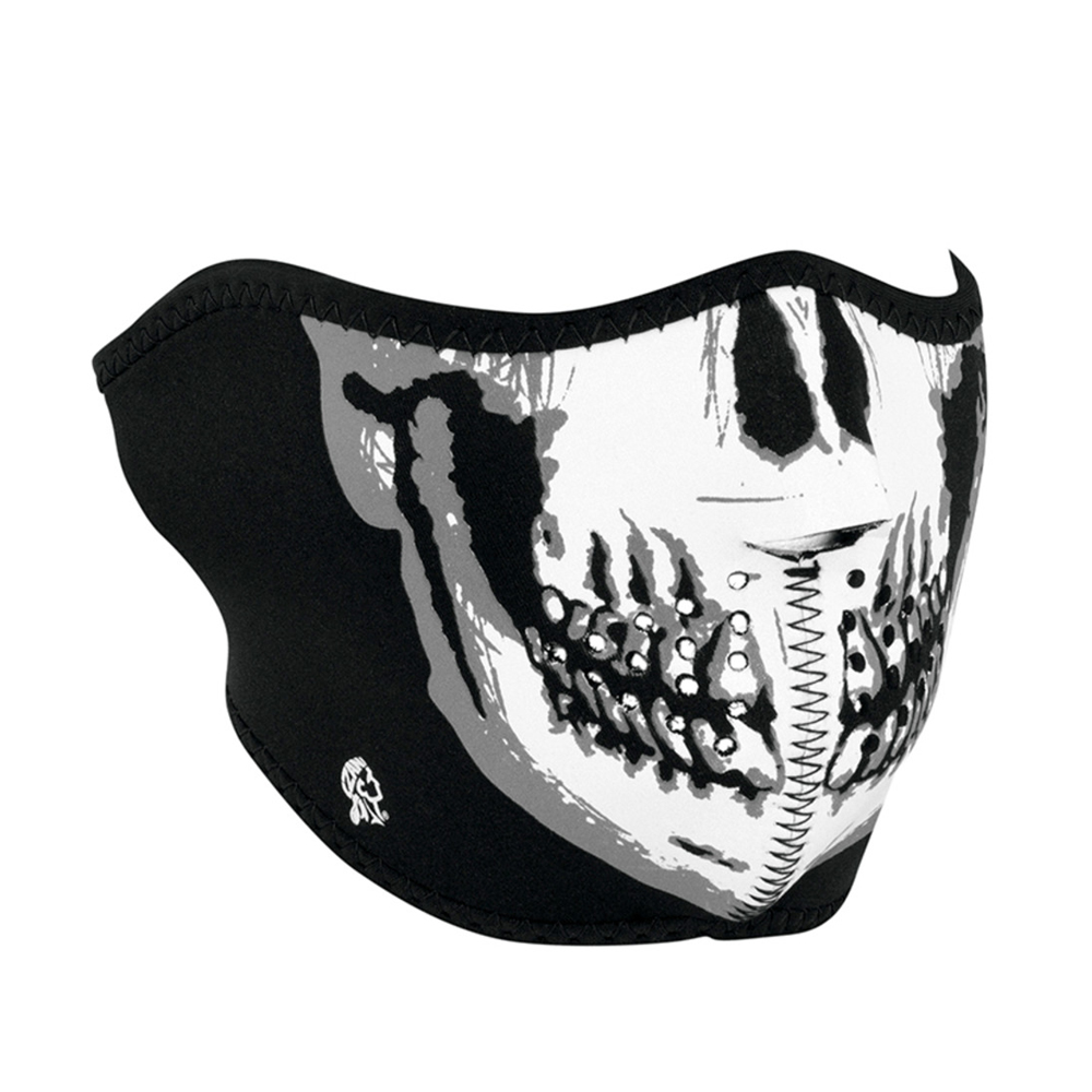 Neoprene 1/2 face mask features full coverage of nose, chin, and cheeks. Stretchy neoprene material is warm and water resistant. Lined with black stretch nylon trim. Patterns are reversible to solid black material. Velcro closure ensures great fit with goggles, with a helmet or without. One size fits most. *NEW* Glow-in-the-Dark Skull Design. Great for night time riding!