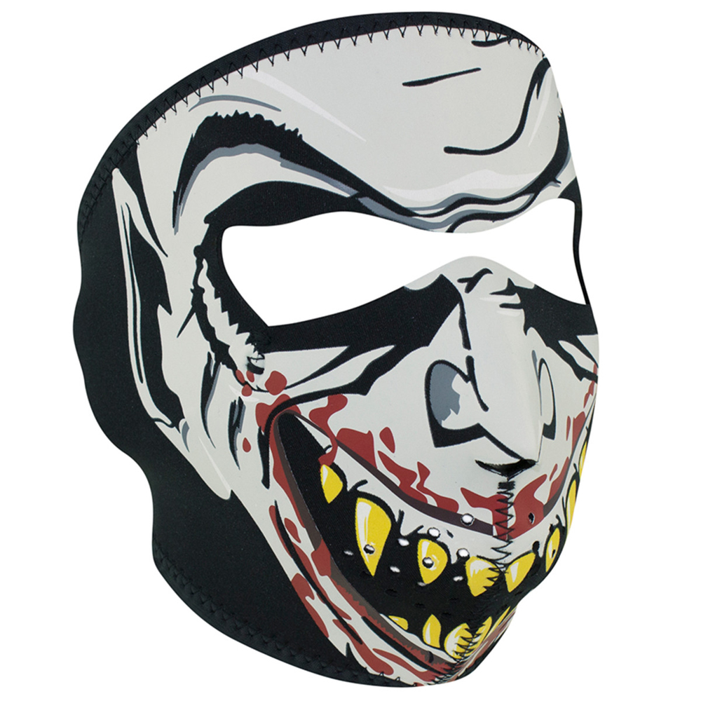 The ZANheadgear Neoprene Face Mask features full coverage of the face and ears with stretchy neoprene material that's water resistant and provides warmth. Its bound nylon edges offers added comfort and durability, while the hook and loop closure ensures great fit. Reversible to black material, one size fits most. Glow in the Dark Vampire design. Material: 70% Neoprene, 30% Polyester.