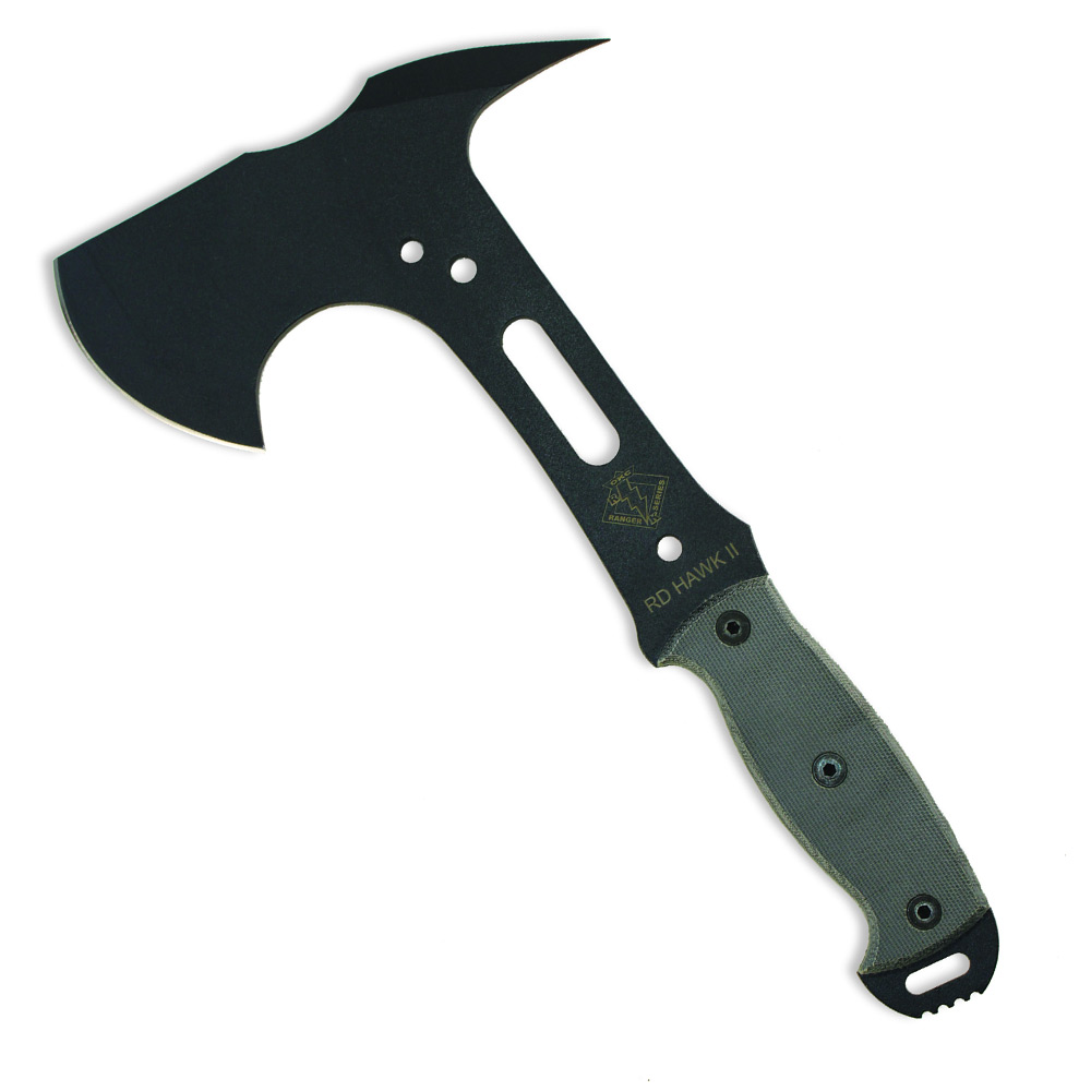 The hawk series feature 1075 carbon steel and black texture powder coated blades. Black nylon sheath is included.