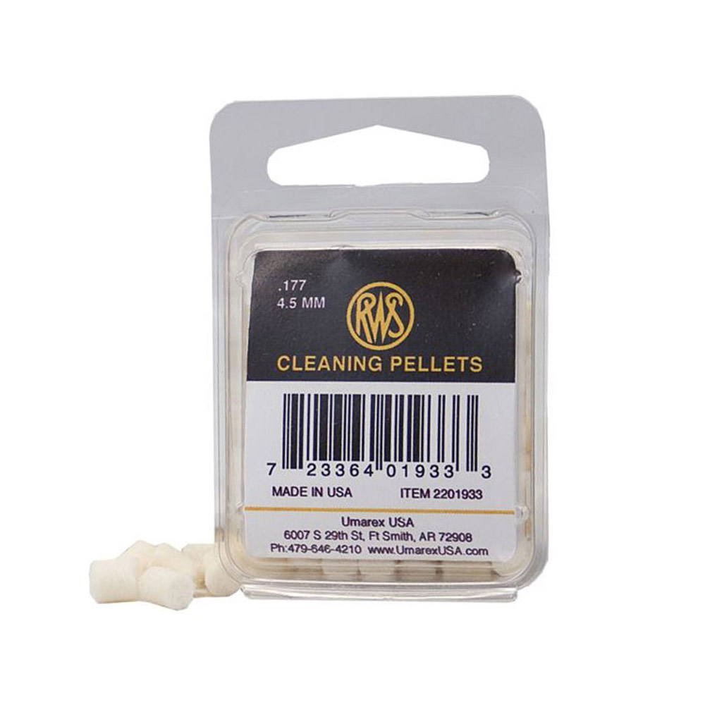 RWS .177 Caliber Cleaning Pellets are engineered for extra length and made from the finest material. The extra length insures full contact with the lans and grooves within the airgun's barrel bore. Place one RWS Cleaning Pellet at the barrel breech using the tip of a RWS Breechway Flexible Rod to start the pellet into the bore. SLOWLY push the pellet down through the bore in short distances of about 1-inch until the cleaning pellet is forced out of the muzzle end of the barrel. Repeat this operation until cleaning pellet emerges from the barrel clean. The Hy-grade felt and extra length of RWS Cleaning Pellets will absorb residue oil, dislodge surface rust and force loose leading out of the rifling grooves. THE RWS BREECHWAY SYSTEM DOES NOT RECOMMEND SHOOTING FELT PELLETS THROUGH THE BARREL unless it is impossible to use the RWS Breechway Flexible Rod on models that have tap loading systems. In these cases the extra length of the RWS Hy-grade Cleaning Pellets help to provide better sealing of the bore to avoid the damage by dry firing effects due to insufficient bore sealing. Bore cleaning by the shoot-through method should never be done with less than two cleaning pellets inserted and expelled at one time. Umarex 2201933