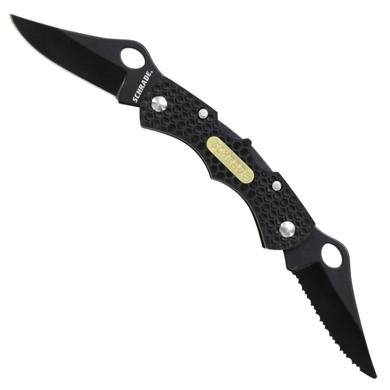 Double down on your everyday carry with this dual-blade pocket knife. The Schrade Double Lockback houses two clip point blades to handle twice the work load. The plain edge blade is hollow ground for clean, razor thin slicing, while the serrated blade can tear through rough materials like a saw. Both blades have a tactical black finish and are housed between the honeycomb scales of the aluminum handle. Open and close either side with matching thumb hole openers and back locks. A stainless steel deep-carry clip is included for comfortable pocket carry.