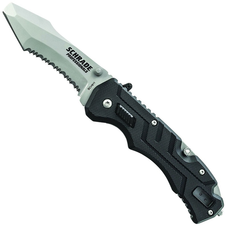 This First Responder knife includes a seat belt cutter, window breaker, and serrated blade with blunt tip.