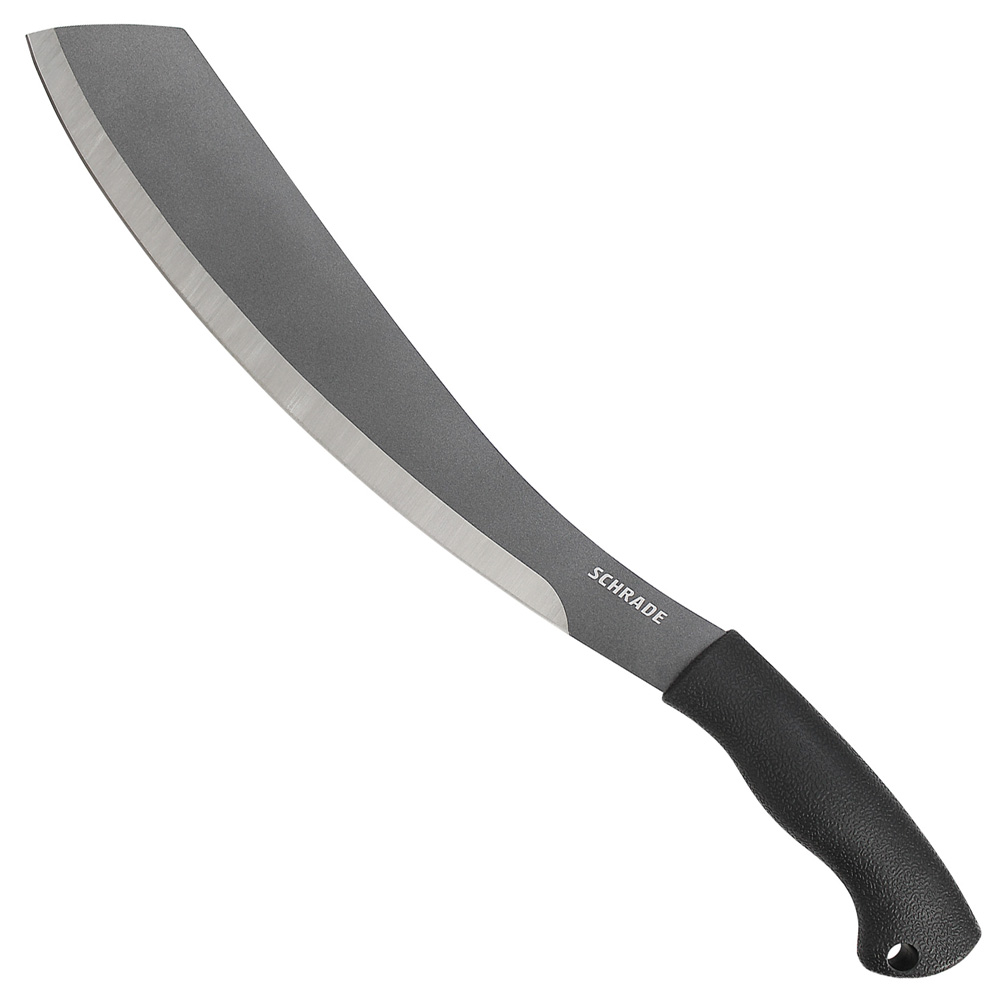The deep dark woods don't stand a chance against the Schrade Parang Machete. This powerful fixed blade uses the traditional parang knife shape, optimized for strong chopping action with an extra wide tip and belly. The blade has a full tang and a stylized black and satin two-tone finish. The handle is a textured TPE mold that swells in the middle to create an ergonomic grip. The package includes a polyester sheath with a clip on leg strap and shoulder harness for your choice of backcountry carry.
