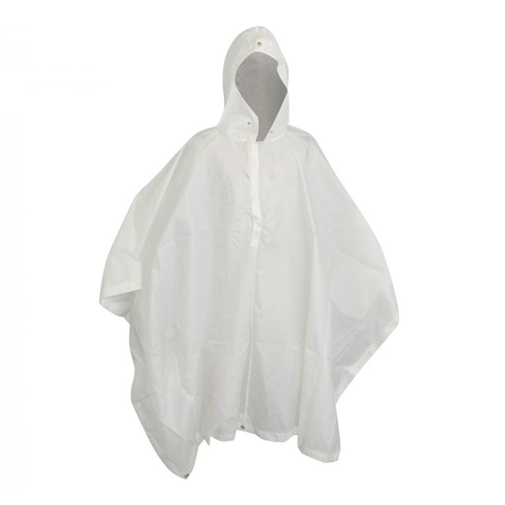 New Swiss snow poncho. Rugged nylon material. Snap neck. Attached drawstring hood wards off wind. Snaps and grommets around edge. Great for hunting in the snow, provides good camoflage. New but may have signs of storage.