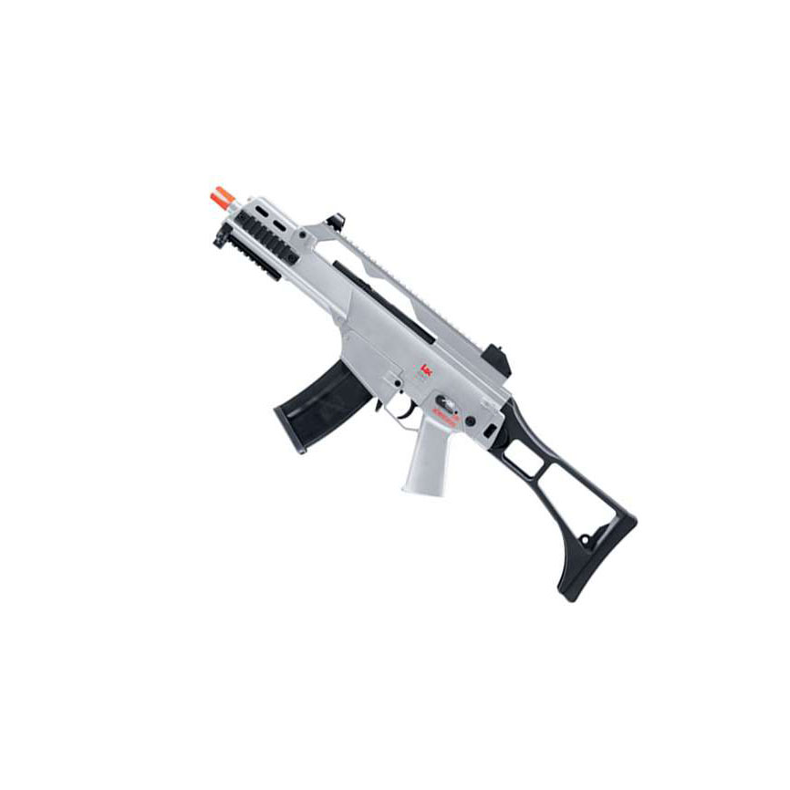 The H&K G36 C Airsoft gun can go between semi and fully automatic with the flip of a switch. The powerful motor allows this electric AEG gun to fire at a very high rate of speed for guns in its class. The foldable stock and adjustable hop-up allow for ease of use and quick reloading. The gun contains an adjustable rear sight for aiming and tactical railing. The 300-shot capacity will allow you to shoot for a long time between reloads. This style of weapon comes in both black and clear finishes. Features: Powerful motor Rapid fire Dual power Foldable stock Adjustable Hop-up Powered by 8.4V NiMH battery Battery & charger included Adjustable rear sight Tactical railing Clear finish