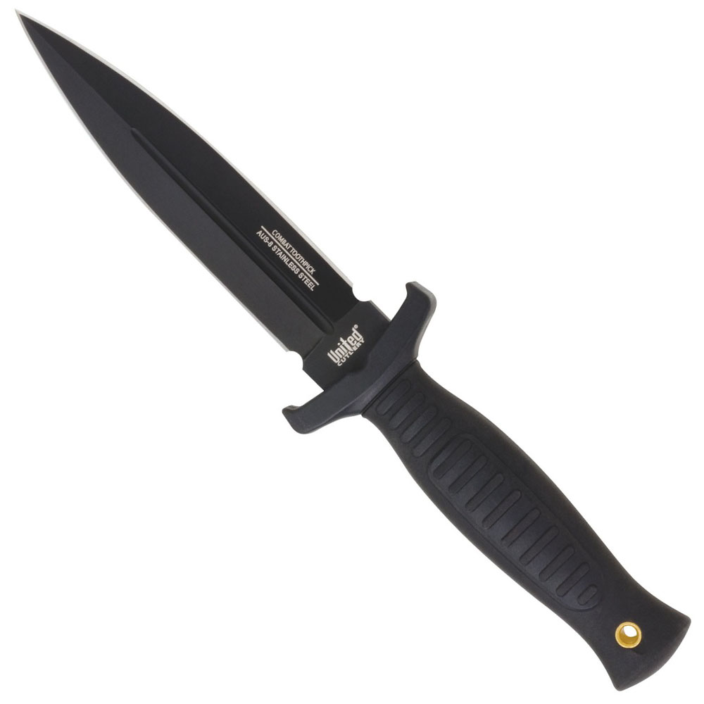 For fast, reliable protection whenever you need it, this United® Cutlery boot knife offers excellent concealment and strength in one small package. Youâ™ll be prepared for almost anything with this menacing black AUS8 stainless steel blade. The handle is constructed from injection molded impact resistant TPR with a brass lanyard sleeve. Includes shoulder harness. Double-edged 5 1/4" bl, 9 1/2" ov