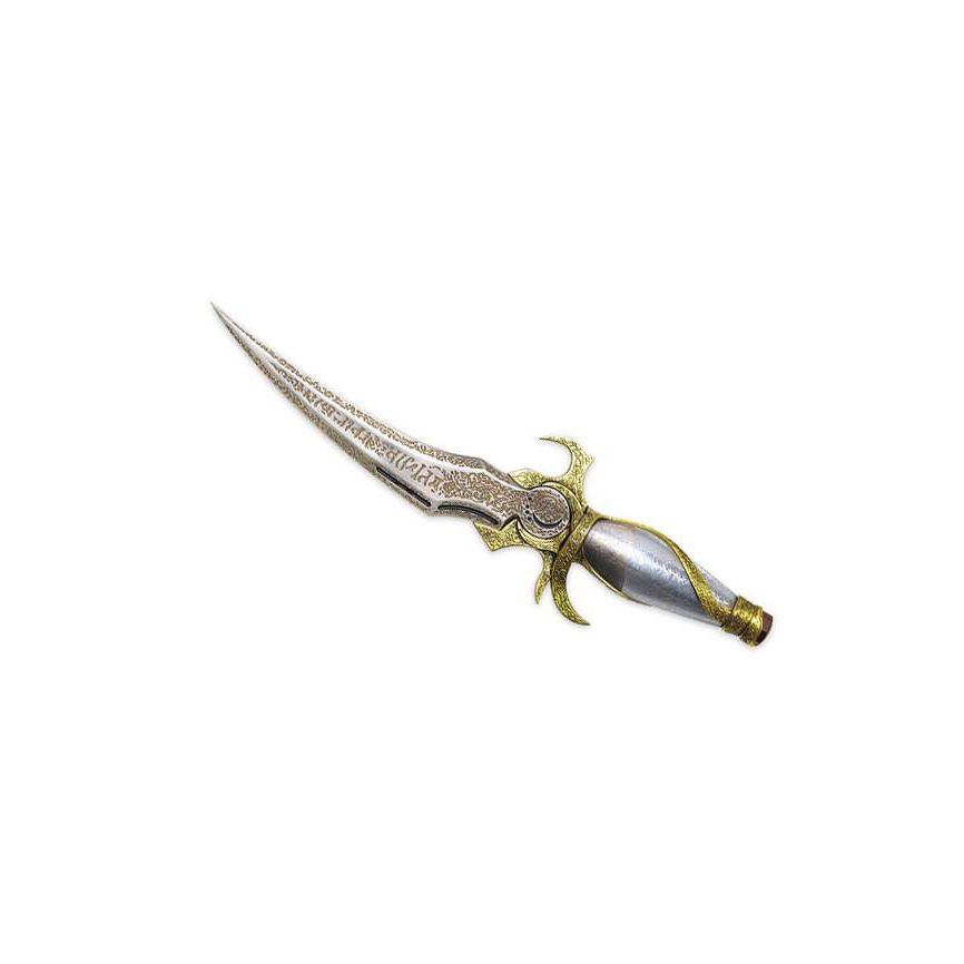 United Cutlery Prince Of Persia Sands of Time Dagger. An exact replica of the one used in the film! As featured in the film The Prince of Persia - "The Sands of Time"! The blade is cast from solid metal, adorned with runes and gold colored highlights, exactly matching the filming prop. Highly decorated hilt parts have been precisely cast of metal and plated with real 18K antique gold. Highlighting the handle is a translucent quartz-like grip that houses the "time-altering" sand, as seen in the film. Ruby accented jewel on the pommel is the perfect finishing touch. Created using the finest grade materials and craftsmanship available, this Replica includes a custom wood wall plaque with a unique silk screen design, a brass shield and a certificate of authenticity.