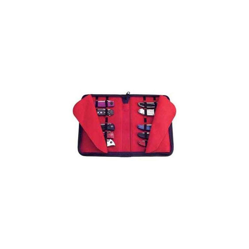 Measures 10 5/8 inches x 7 1/8 inches. Black imitation leather construction with red cloth interior. Zipper closure. Holds approximately 16 pocket knives. Bulk packed. (Knives not included)
