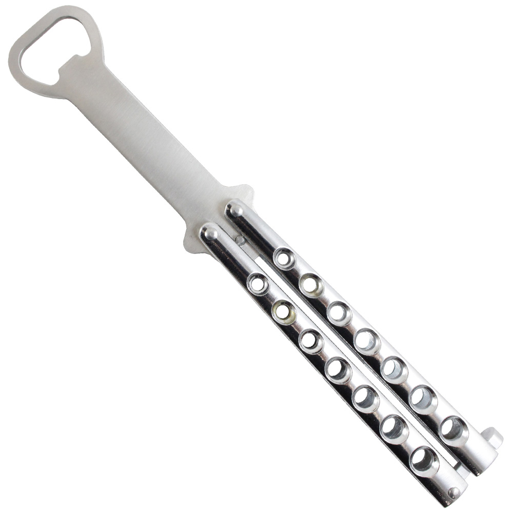 Bartending and balisong flipping go hand in hand with this Gear Stock butterfly knife bottle opener. This fully-functional balisong trainer has a full metal construction with a realistic weight and balance to practice your moves. Best of all, the blade has been replaced with a bottle opener, so you can crack open a cold one in the coolest way possible. This model features a silver finish.