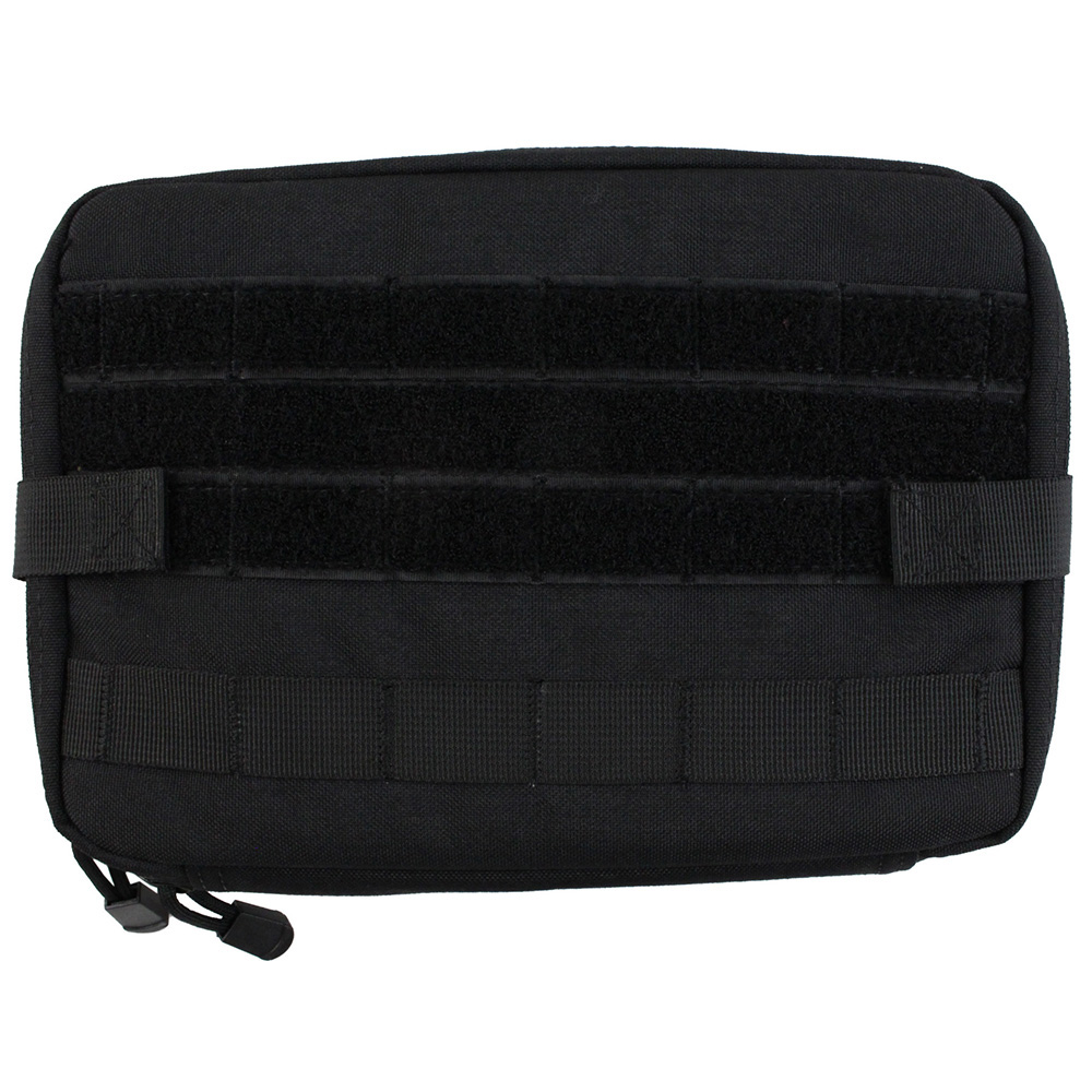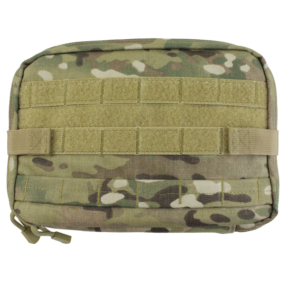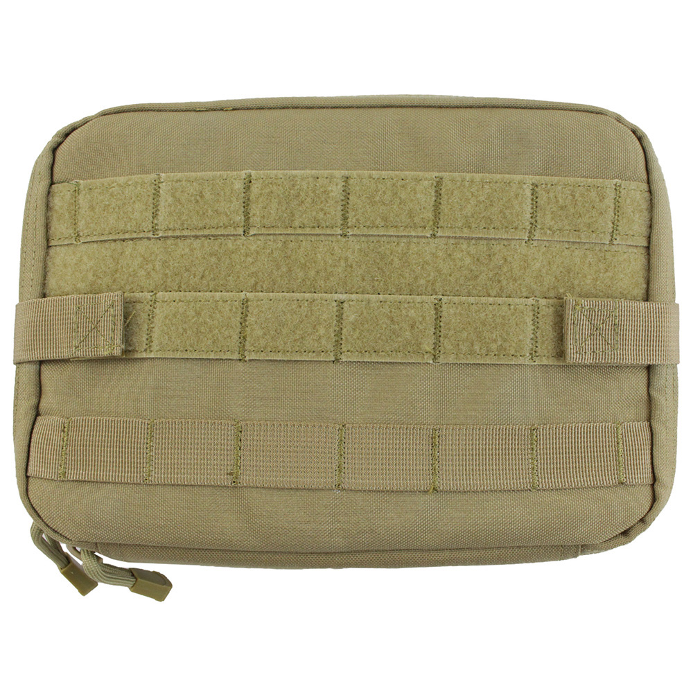 This sleek and slim utility pouch doesn't just hold your field gear, it unfolds into a portable work station. The inner paracord draw string can be adjusted to any angle, providing a clean work space for delicate tasks. The main compartment contains a removable vinyl sleeve and a series of elastic holders to secure your tools and documents. Attach it to any gear or equip it with auxiliary pouches using the exterior PALS back straps, MOLLE webbing, and hook and loop panels. This tan model is camouflaged for desert terrain.