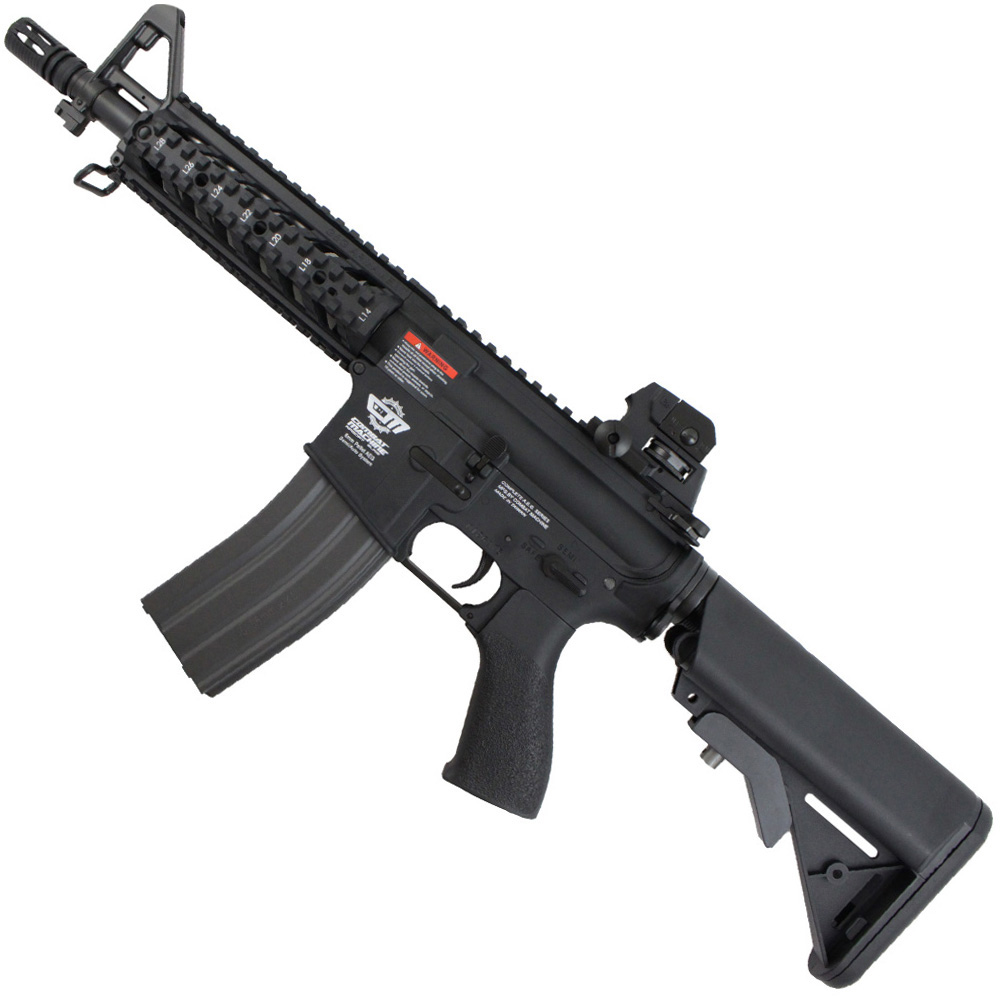 The G&G CM16 Raider will get you close to the action with its short CQB barrel, lightweight polymer M4 frame, and retractable crane stock. A full length optics rail and quad RIS handguard allow for the addition of tactical accessories like forward grips, laser sights, and scopes. It comes equipped with G&G's standard V2 full-metal gear box, a hi-cap 450 round magazine, and an integrated rear sling mount. This tacitcal black M4 AEG rifle is primed for fast maneuvers around tight corners. Batteries and charger not included.