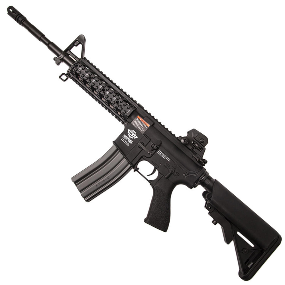 G&G have brought in the heavy artillery with this larger model of the CM16 Raider Airsoft Rifle. The Raider-L is a full scale M4 featuring an extended barrel and a customizable quad-rail hand guard. Despite its massive size, a polymer frame keeps this AEG light-weight and maneuverable in the field. It comes equipped with front and rear sling attachment points, a six-position crane stock, and a hi-cap 450 round magazine. This tactical black model is primed for covert operation. Batteries and charger not included.